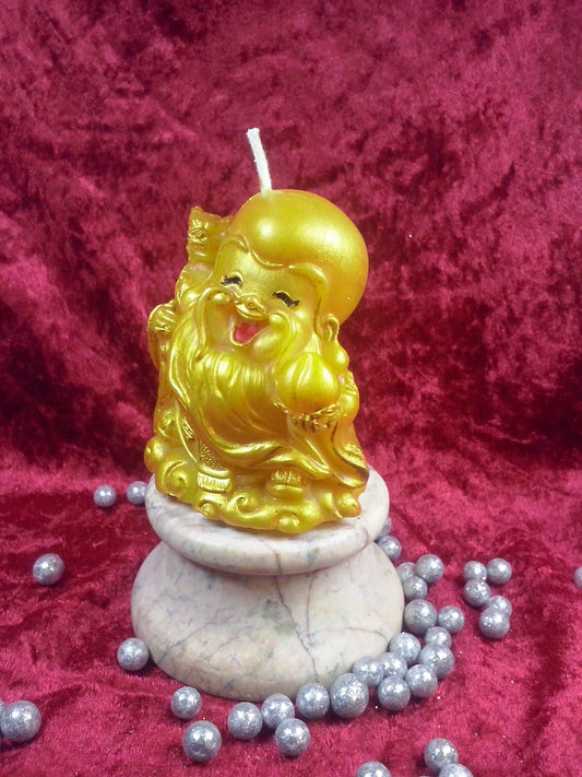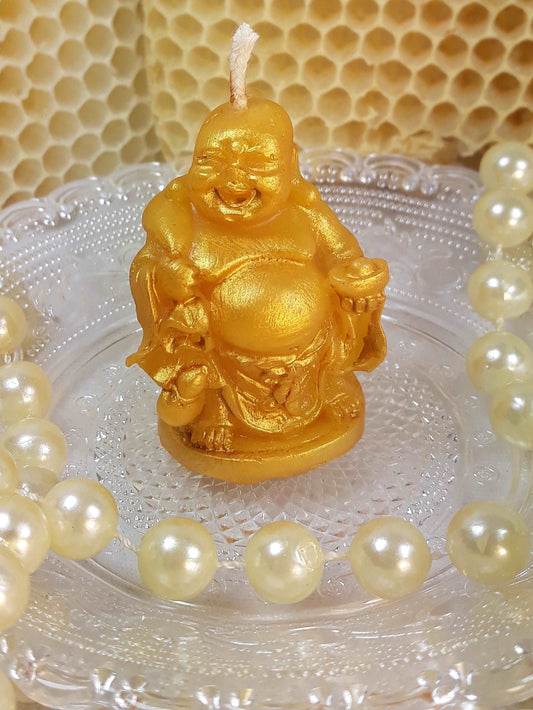 Kleiner, dicker, lachender, goldener Buddha, Bienenwachskerze